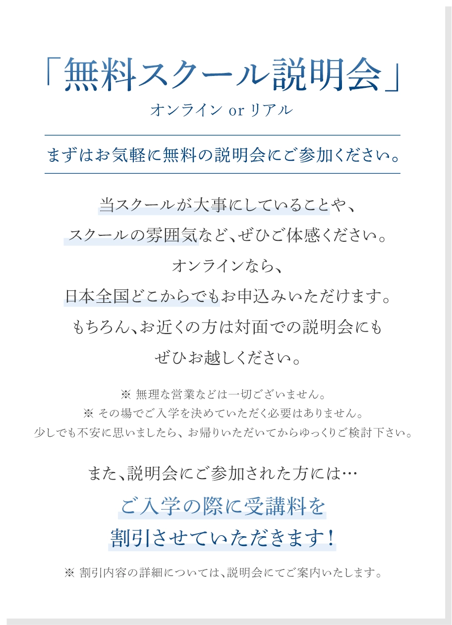 そのほか、学習内容や受講方法についての疑問や、不安に感じていることがあれば、その場でご質問いただけます。