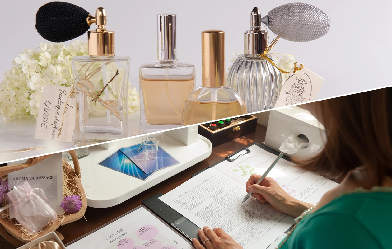 40種以上の精油を使いこなす調香力に加え、独自のカウンセリングメソッドを通して、クライアントの想いや願望を丁寧に引き出していきます。